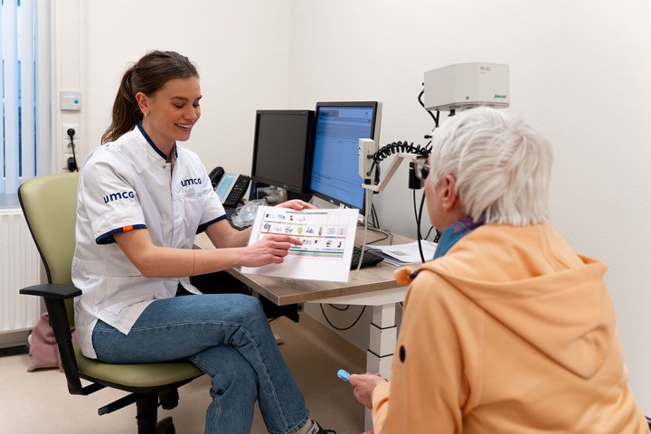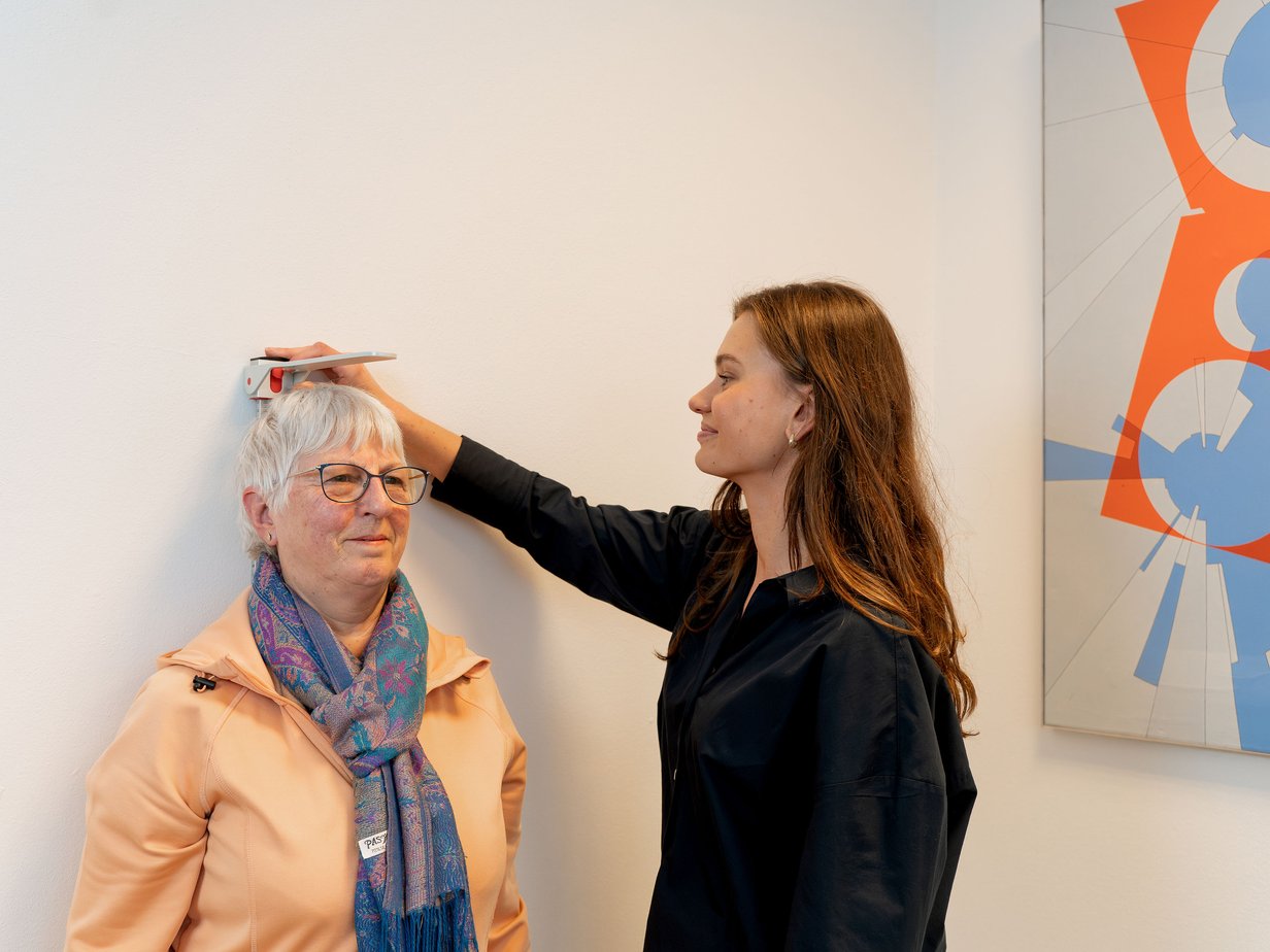 Lichamelijk onderzoek waarbij we uw bloeddruk, handknijpkracht, loopsnelheid en balans, buik-, heup-, kuit-en bovenarmomvag en lengte en gewicht meten.